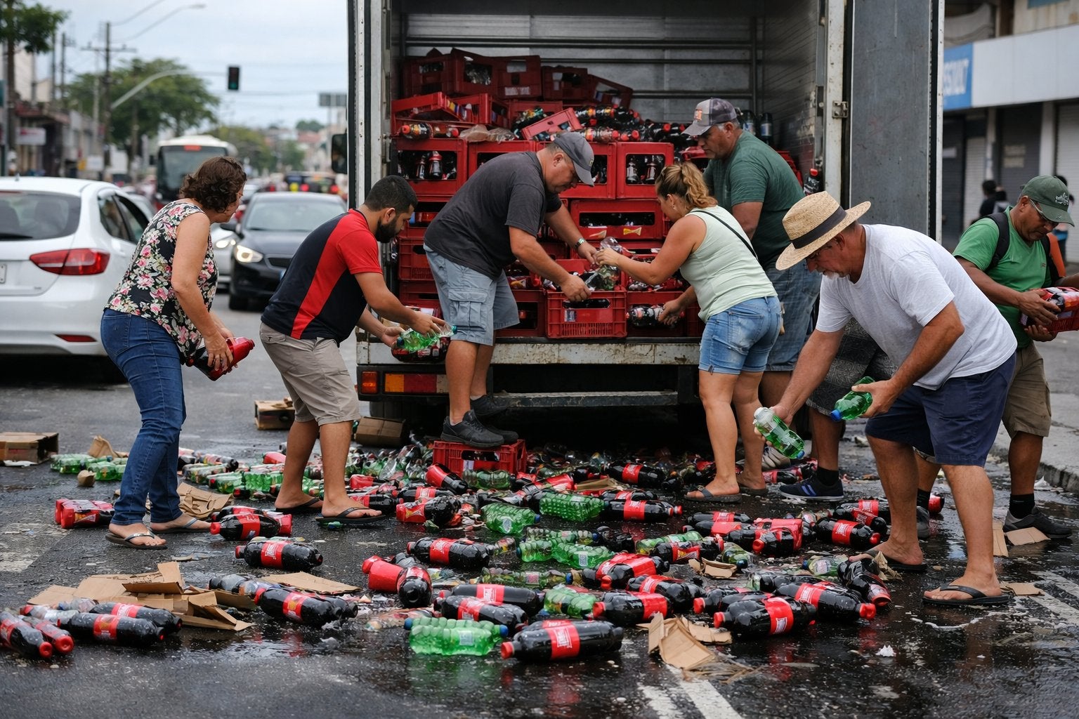 Um episódio inusitado registrado no último sábado (20/02) no Espírito Santo chamou a atenção nas redes sociais e acabou viralizando pela atitude da população. Um veículo que transportava refrigerantes perdeu parte da carga em uma via pública, espalhando centenas de garrafas e latas pelo asfalto.