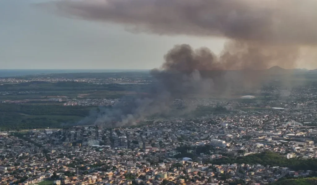 As chamas atingiram uma área de vegetação e geraram grande volume de fumaça, visível de diferentes pontos da Grande Vitória, incluindo Vitória e Cariacica.